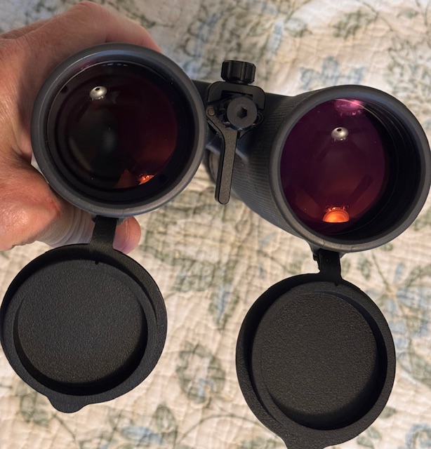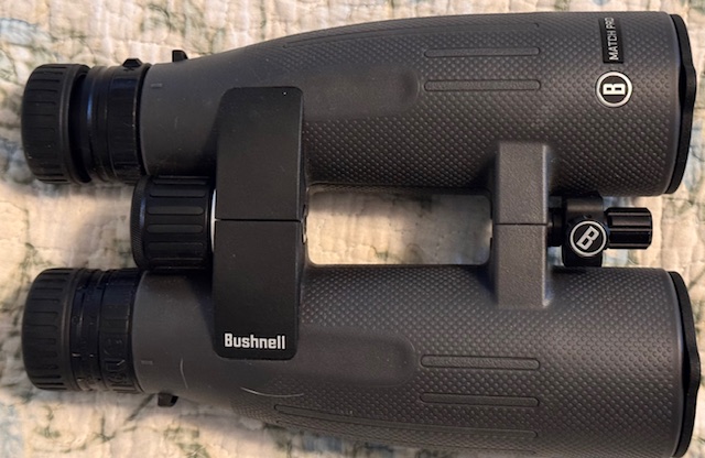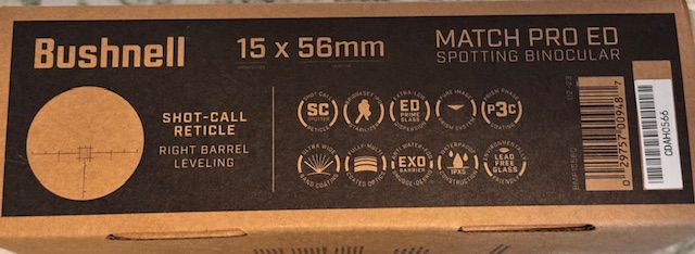 The Bushnell Match Pro binoculars are 15x56 with sharp glass and a titanium gray housing. They come with a modest box and nylon case, a mount for your tripod and a limiter so you can lock the binos in that perfect eye position. Manuals are on-line. The link takes you to Bushnell's site and show all details and specs.